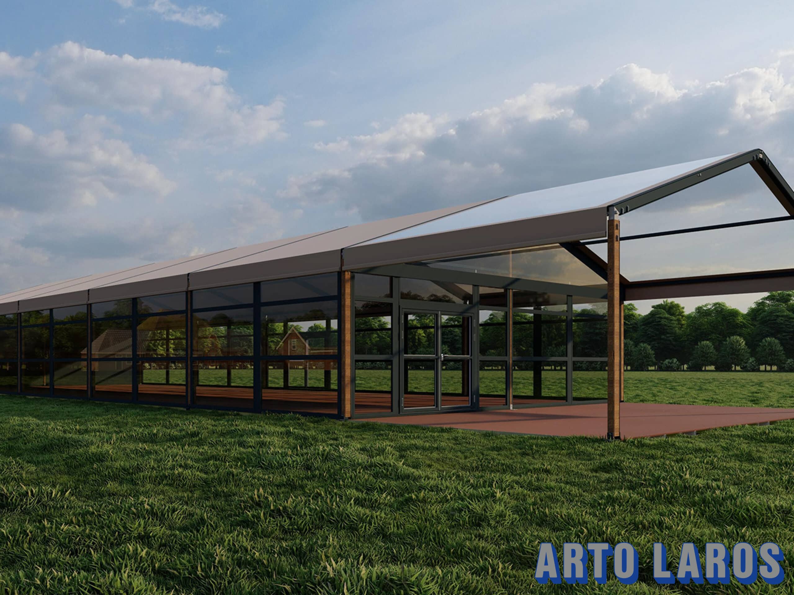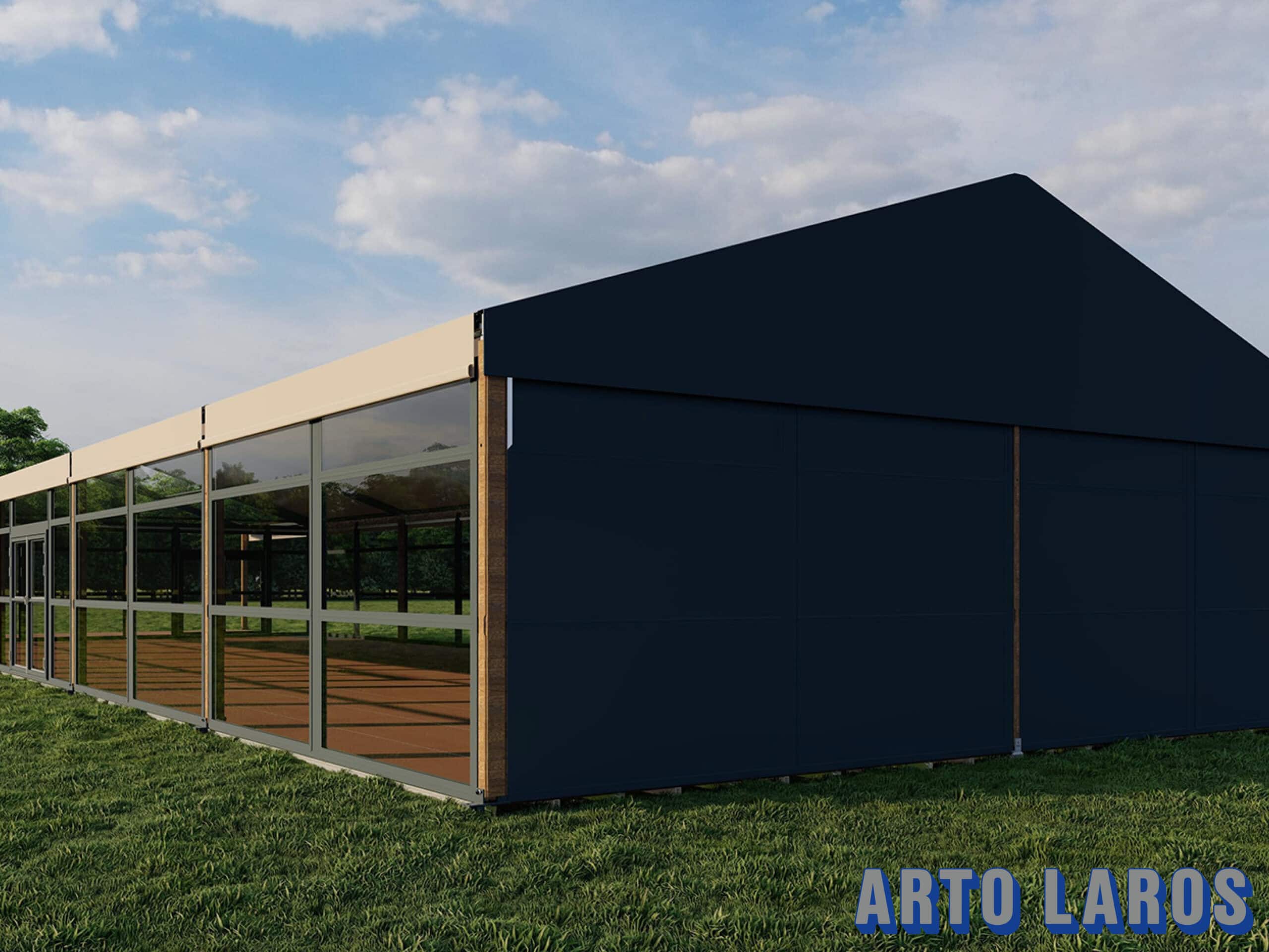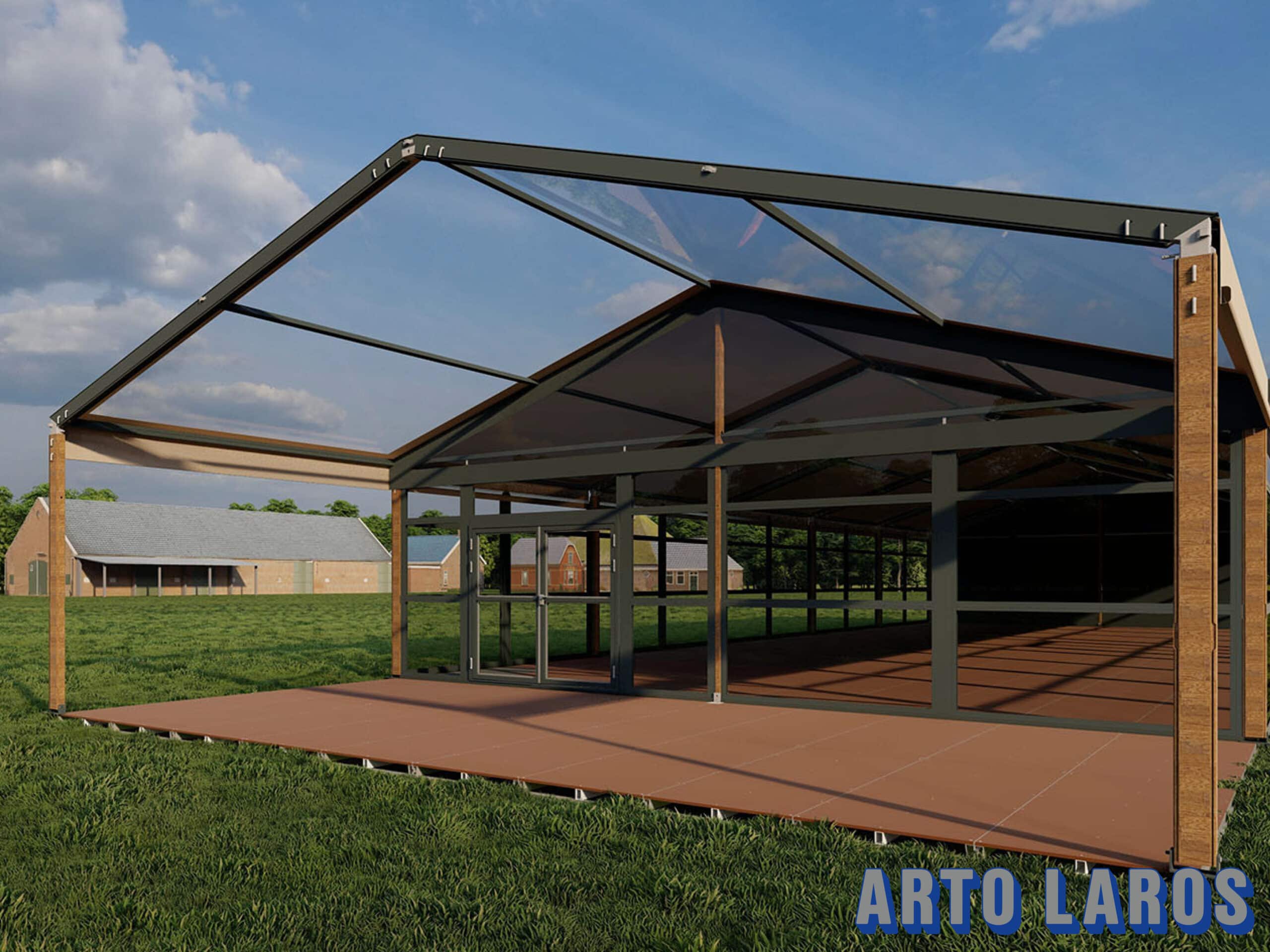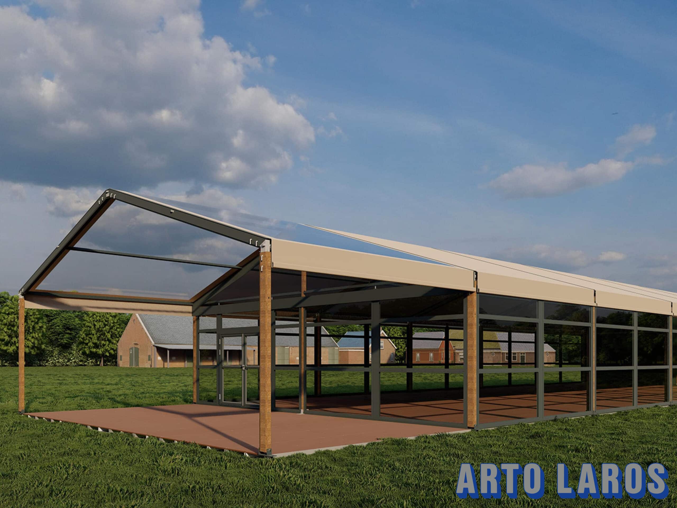 Een aluhal bestaat uit een aluminium constructie, licht en sterk materiaal. Deze constructie zorgt er ook voor dat een vrije overspanning mogelijk is, dus geen masten in het midden van de tent. Een groot voordeel is dat deze aluhal flexibel aan te passen is in de lengte.