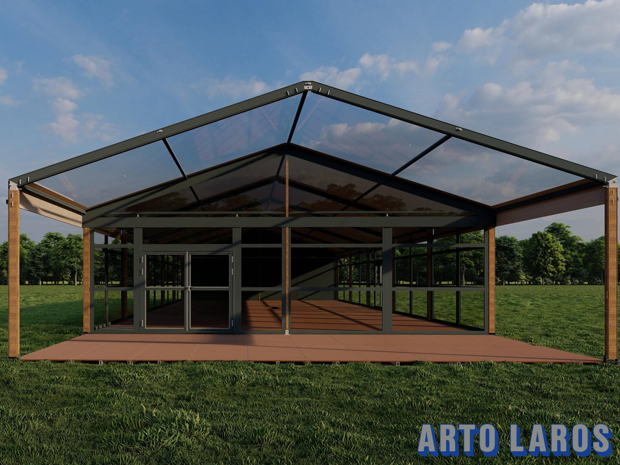 Op zoek naar een trendy aluhal? Nieuw in ons assortiment is deze moderne aluhal, de hal heeft antracieten kozijnen, glaswanden, antracietkleurig dakzeil en houtaccenten. Een transparante terrasoverkapping behoort ook tot de mogelijkheden.